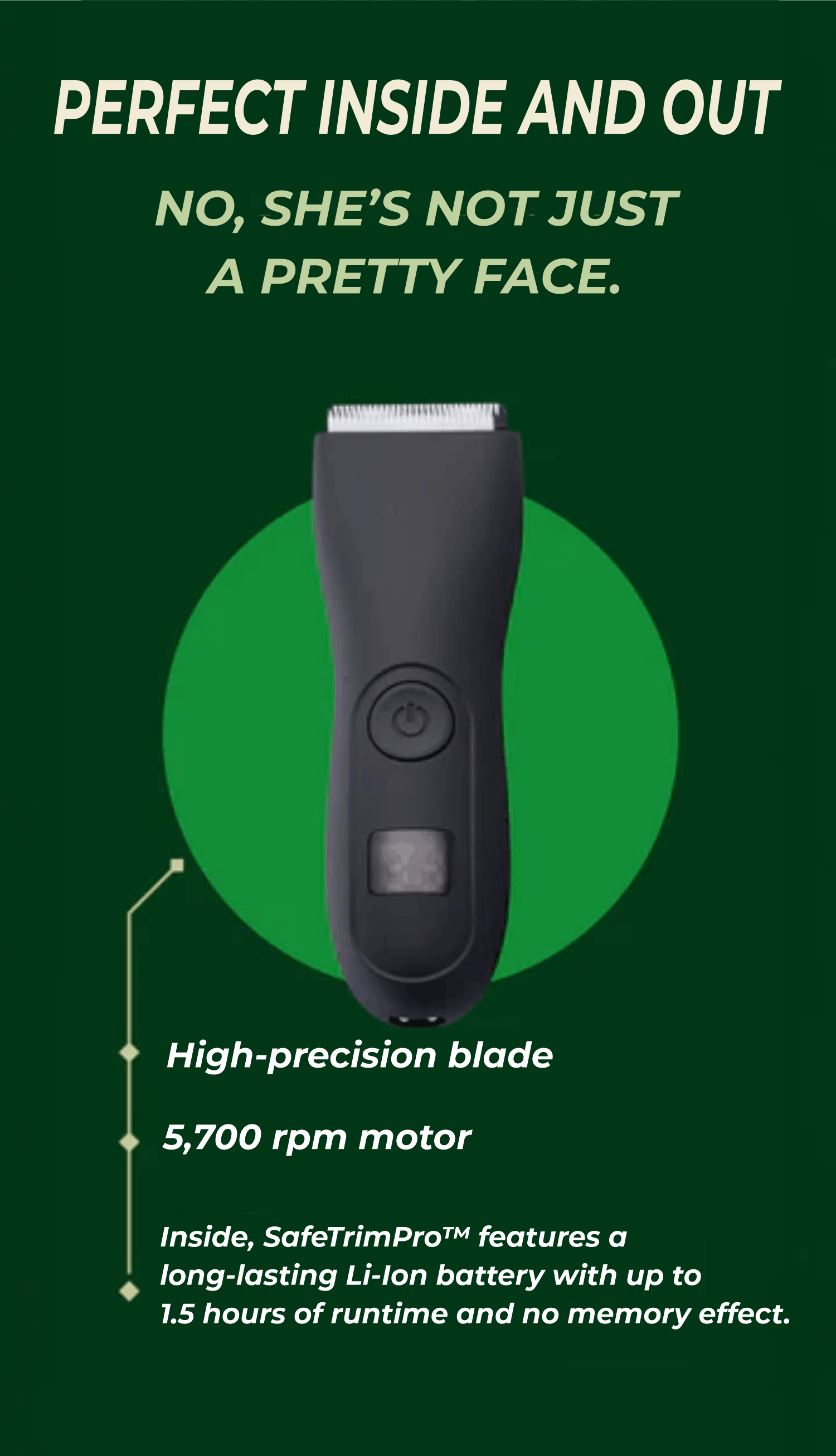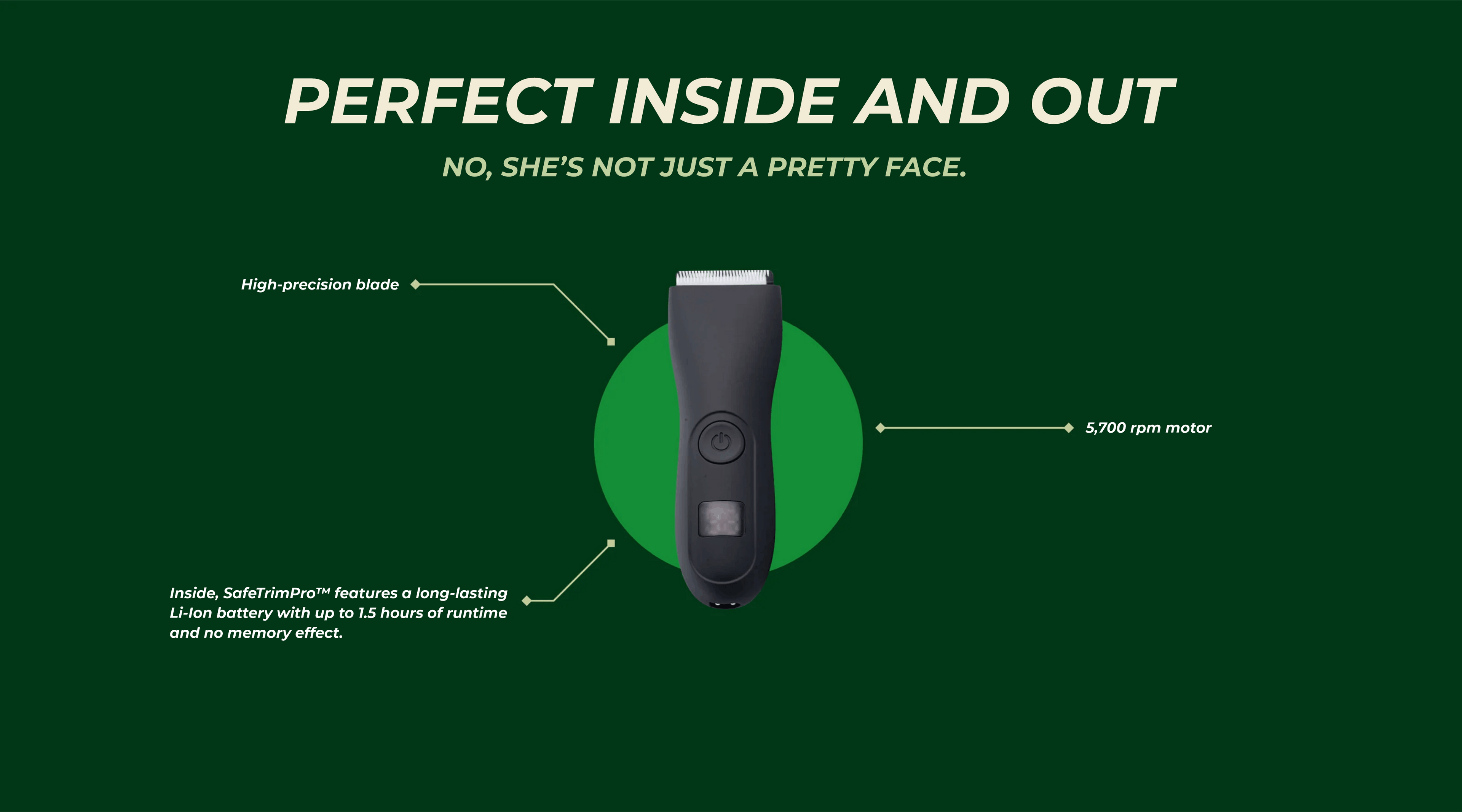SafeTrimPro™ was developed with No-Cut Technology, meaning you’ll never have to worry again when trimming your intimate areas. Even in the most sensitive zones, you can groom with complete confidence, enjoying a smooth shave without irritation, discomfort or those unpleasant pinches.